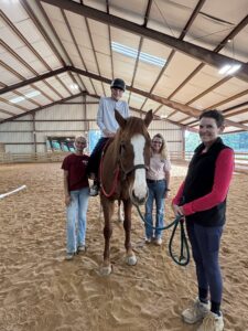 Davis’ enthusiasm for riding is truly infectious. He’s always eager to greet his friends and family with a wave or a kiss, and his positive energy brightens up the arena. Over the past year, Davis has made significant strides in his riding, confidence, and horsemanship. His friendly and welcoming nature uplifts volunteers and staff at the barn.
