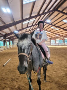 Kathryn has been riding at HORSEPOWER since 2008 and it is the highlight of her week. She has been riding Trader for the last several years and loves showing him her nail polish each week and which doll will be riding with her. While Kathryn is nonverbal, she and Trader have no problem communicating with each other. The horses at HORSEPOWER have a special sixth sense about their riders and know just what they need. Kathryn has a constant smile on her face sitting atop Trader and loves wearing her Barbie cowgirl attire to match her horse leader, Colleen. We are very thankful for the horses, staff, volunteers, sponsors, and donors like yourself who help make the magic possible at HORSEPOWER. Please consider donating to this amazing organization!