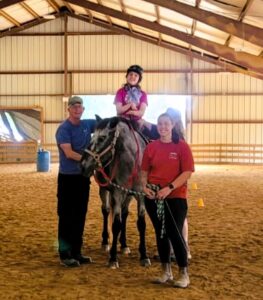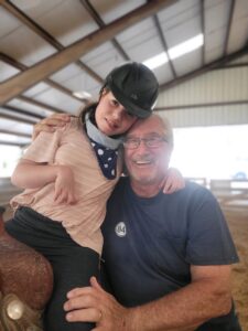 Veyla has been riding with Horsepower for 8 years and has grown into a confident rider and she loves her time at the farm. She loves her horse, Trader, and almost always gives him kisses after her ride. Veyla also has an amazing relationship with her long term side walkers (Carla and Chester).