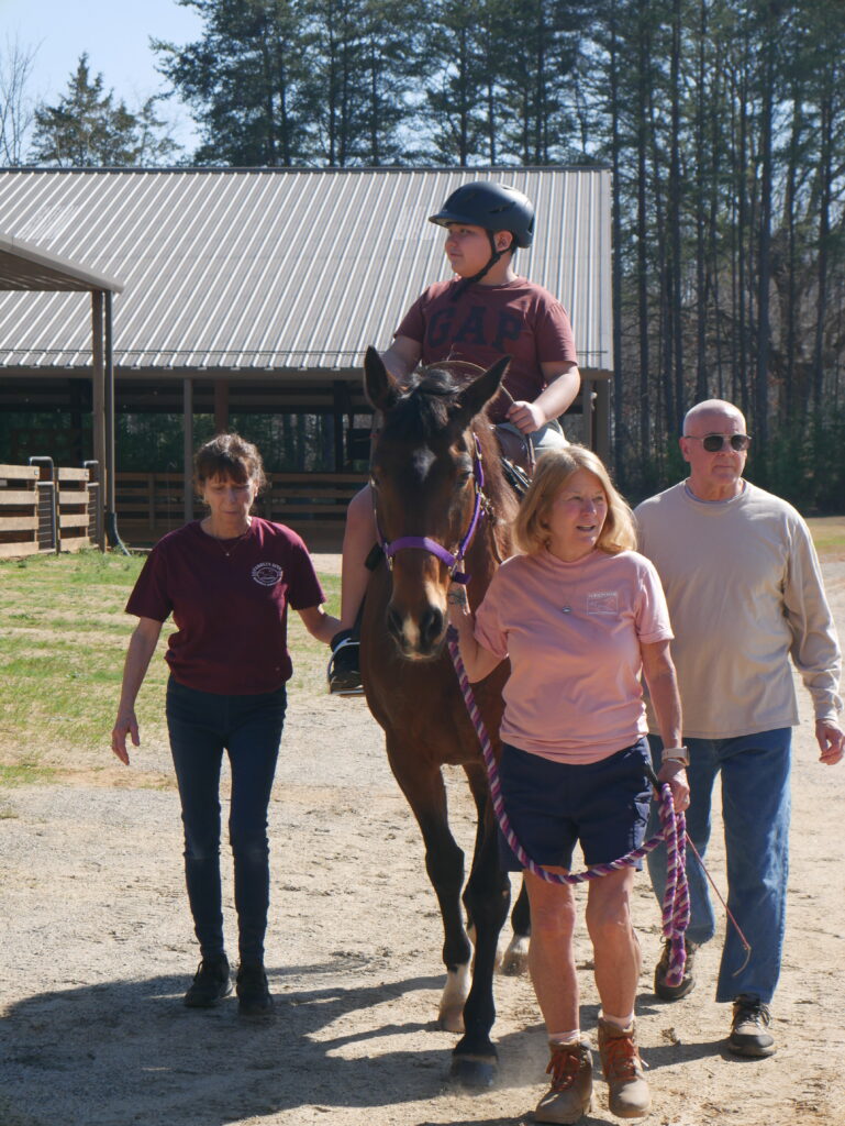 The trail offers something different. Outside, riders experience changing scenery, new sounds and smells, and the gentle variation of natural terrain. These small changes help riders develop balance, body awareness, and strength. The natural setting can also be calming, helping riders relax and enjoy the rhythm of the horse’s movement.